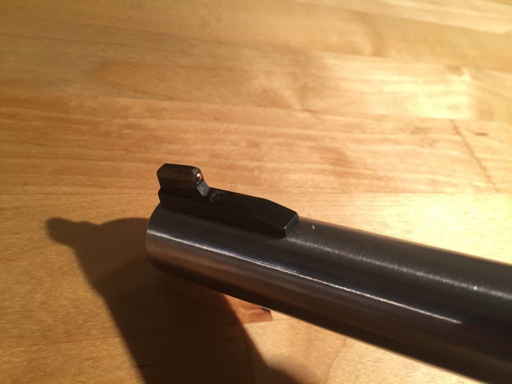 2. Copper bead front sight. I got tired of losing the front sight against the background at indoor ranges. Pre drilled the hole with a dremmel and 1/32 bit. Then opened it slowly with a hand drill and 3/32 bit. A small scrap of 14 ga. ground wire fit perfectly. I ground the wire to a rounded end and then set it in place with a tap from a punch. Much easier to see, just like my 10-8 brass bead sight on my glock. I used copper vice brass because I had it available.