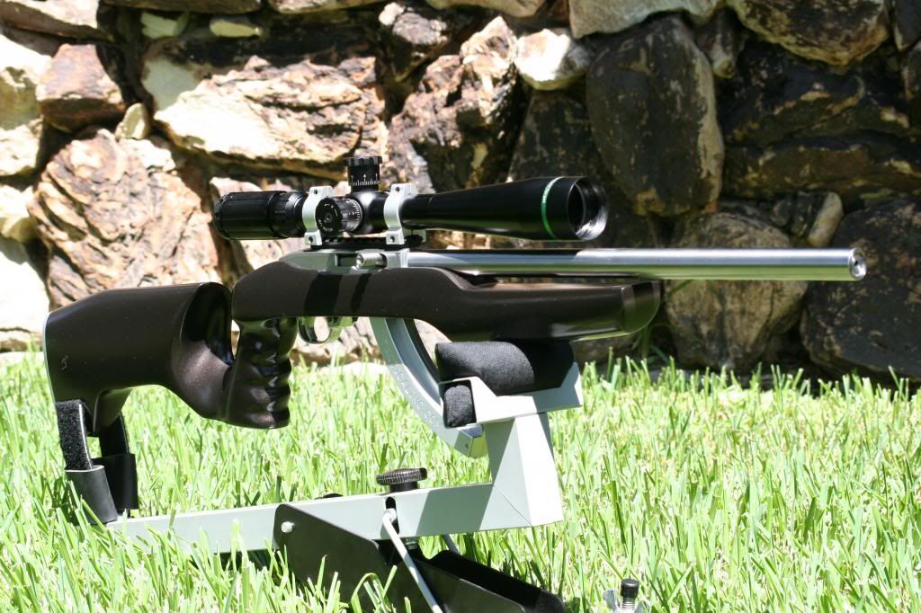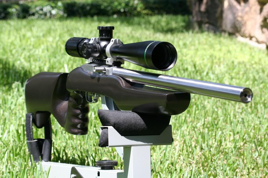 In this configuration I had to really work at it to shoot any better than 3/4" at 50, and even then it didn't seem to be consistent. I read alot about the AR7 barrels and was not overly impressed. When InfamousJ inquired about it recently, I looked through my parts pile and found a polished 18" Shilen barrel and a Mueller 8-32X Target that I thought might help me in the accuracy department.